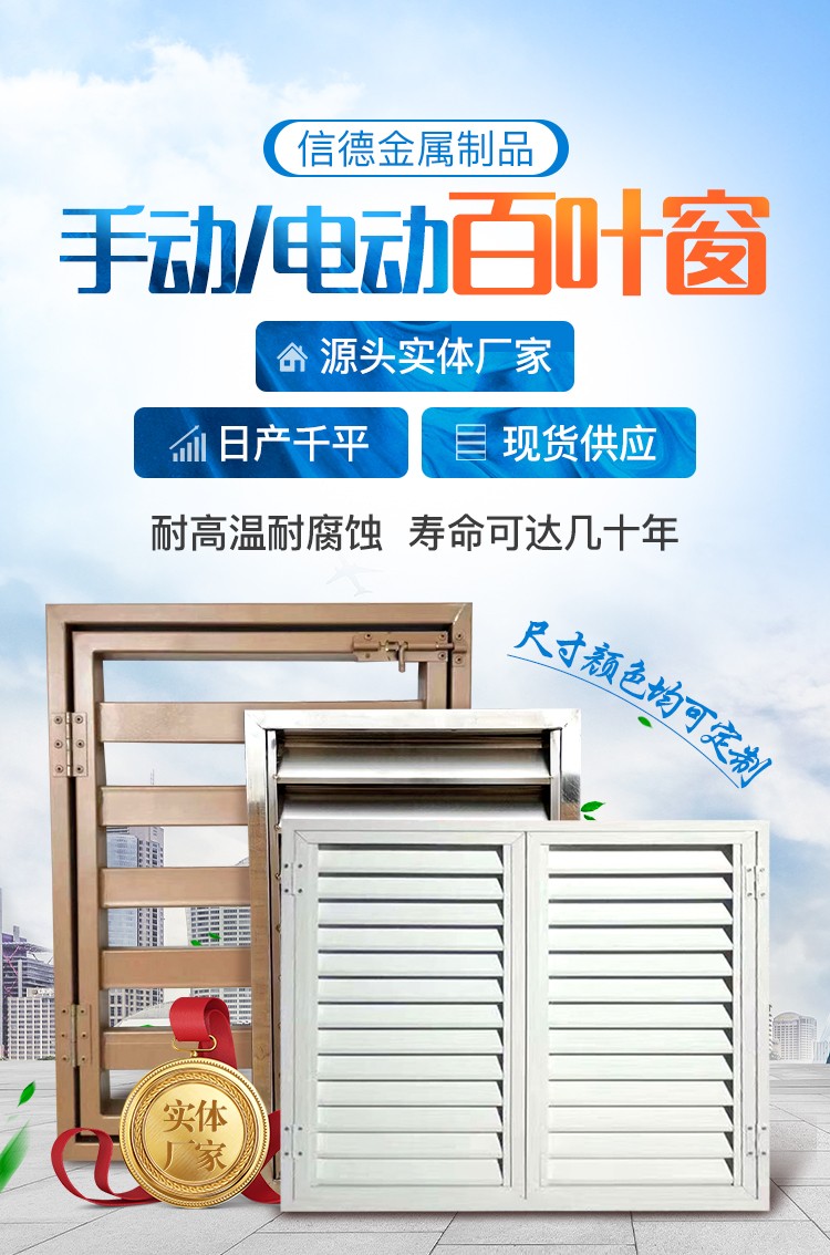 任丘市信德金屬制品有限公司集研發(fā)、制造、銷售、安裝為一體,專業(yè)生產(chǎn)手動百葉窗、電動百葉窗、鋅鋼百葉窗,鋁合金百葉窗,空調(diào)護欄,空調(diào)罩百葉系列產(chǎn)品的河北百葉窗廠家。先進的生產(chǎn)設備、精良的生產(chǎn)工藝、完善的檢測手段、使產(chǎn)品質(zhì)量達到國內(nèi)、先進水平、贏得了廣大客戶的依賴和社會的肯定品廣泛使用于家庭、企業(yè)、單位、小區(qū)及建筑工程公司等。